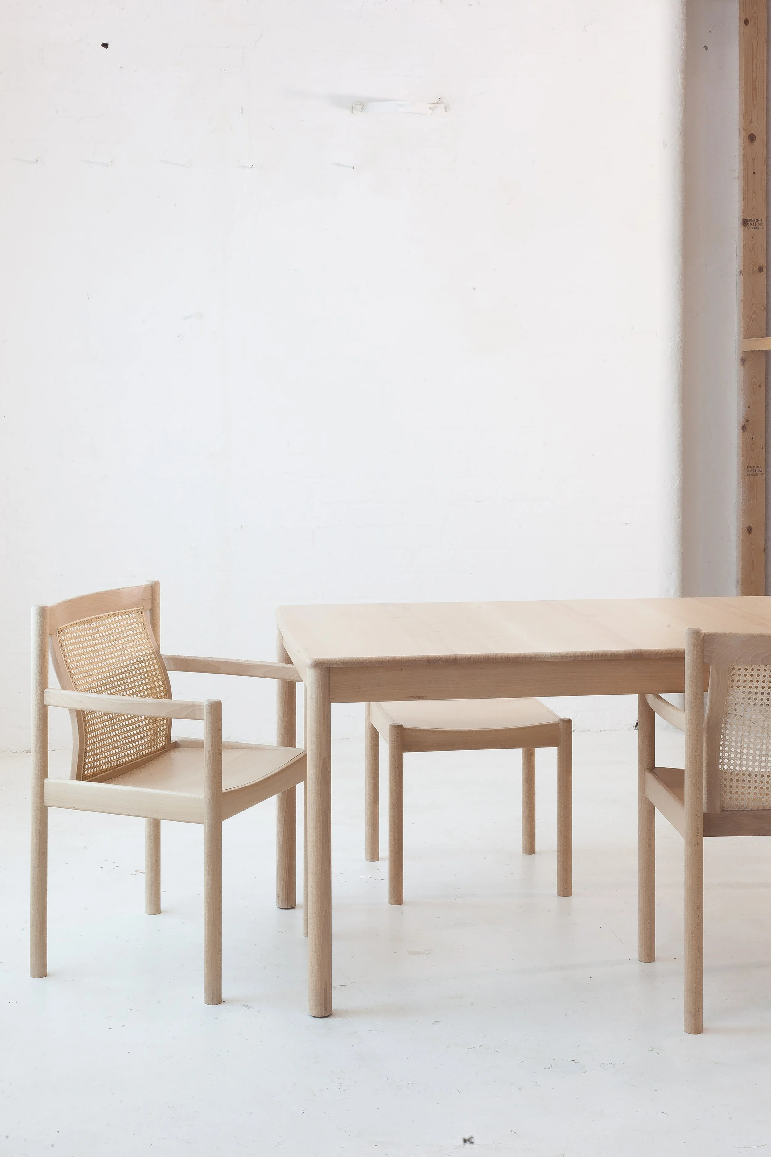 The set is based around boxy silhouettes and soft forms using dowels and rounded double tenon joinery. Influences draw on a mix of Danish design and Anglo-Indian furniture.