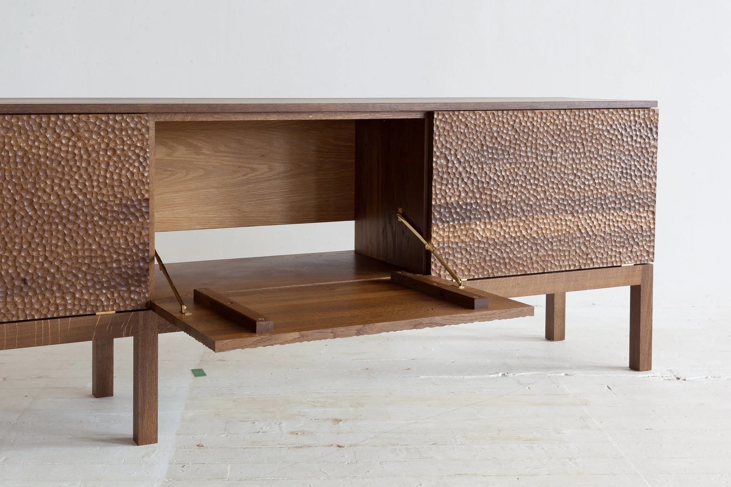 By removing any unnecessary detailing, joinery, and shaping, the form serves primarily to frame the sculptural doors and celebrate the natural beauty of the fumed English oak.